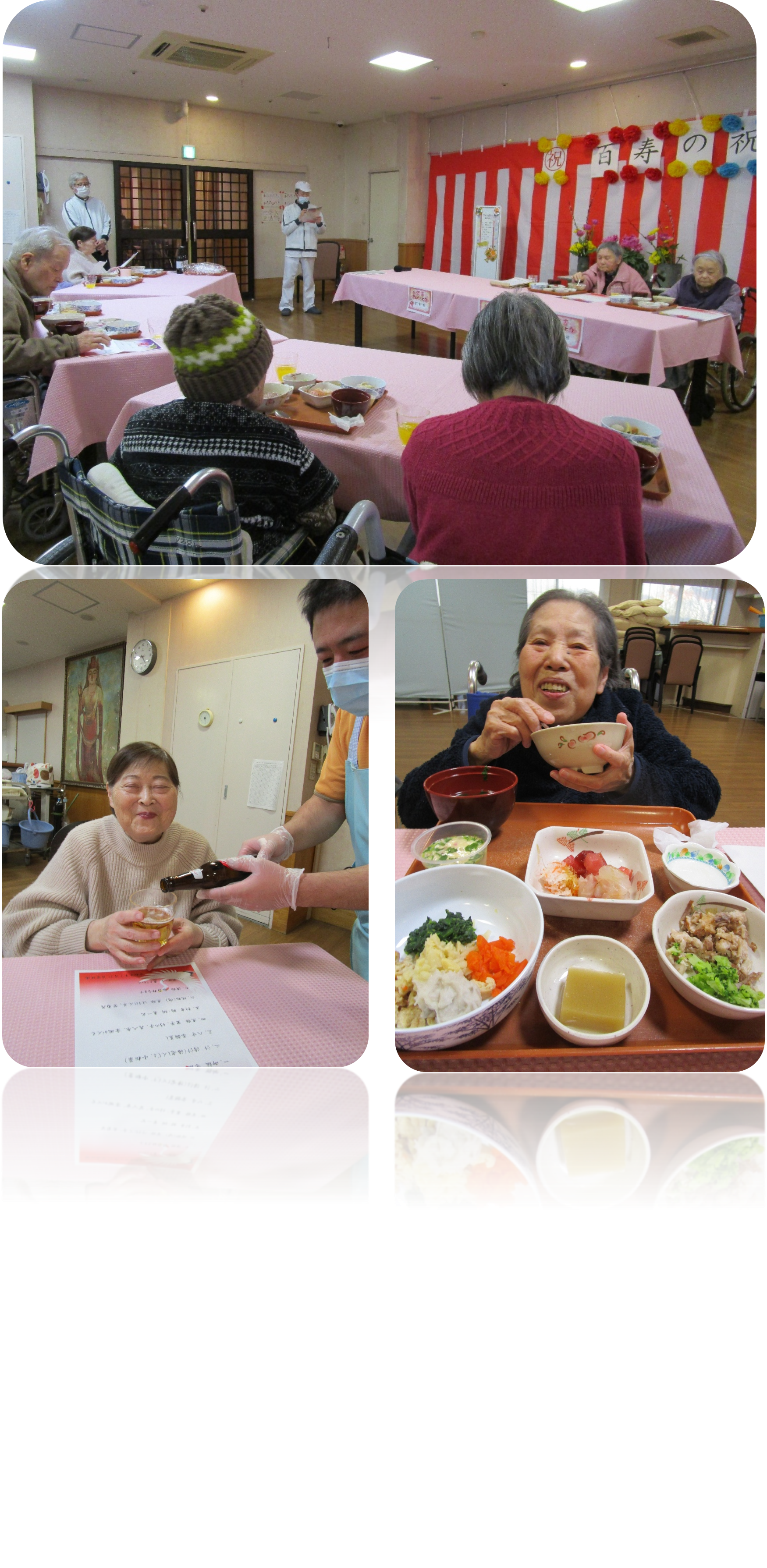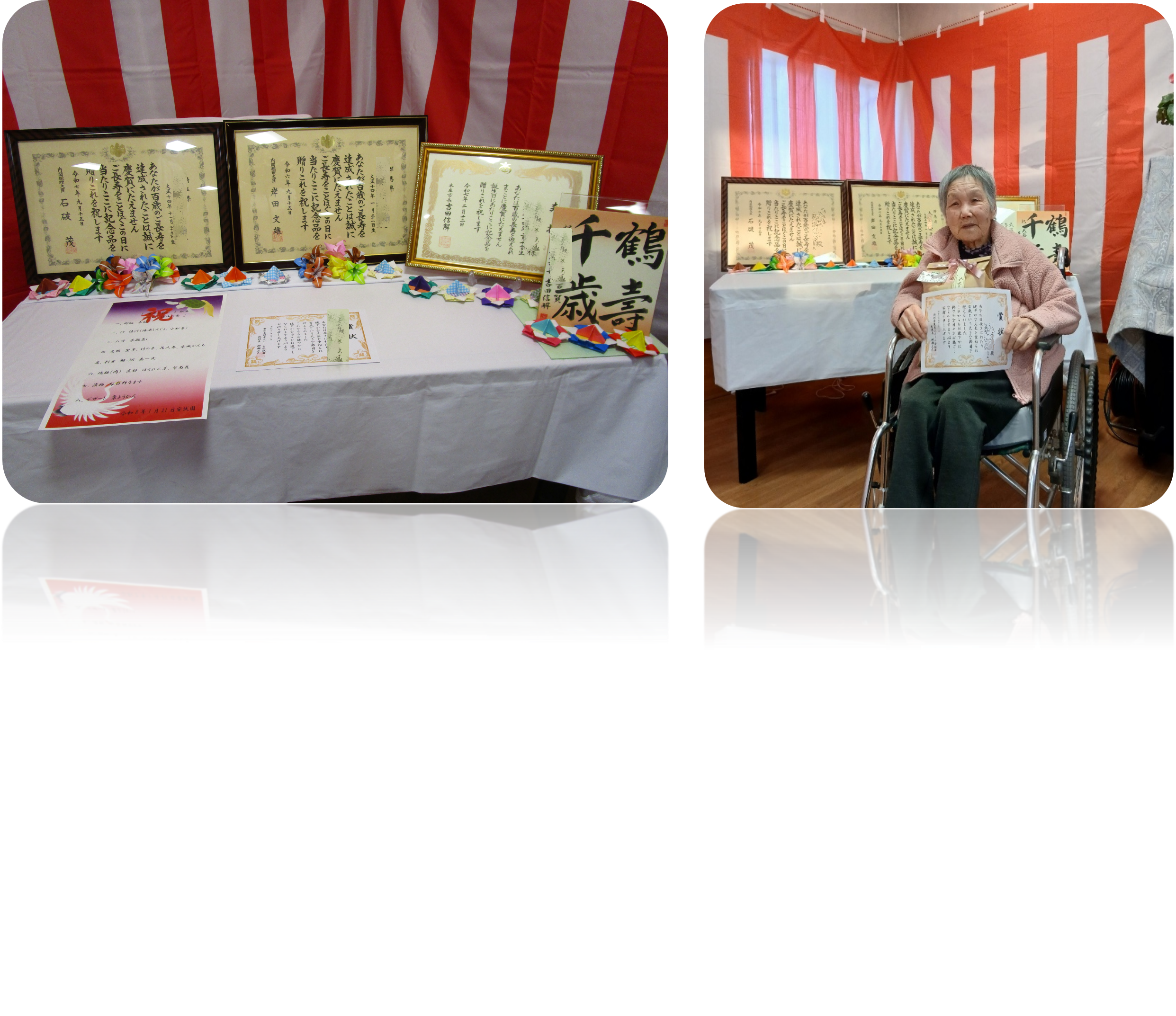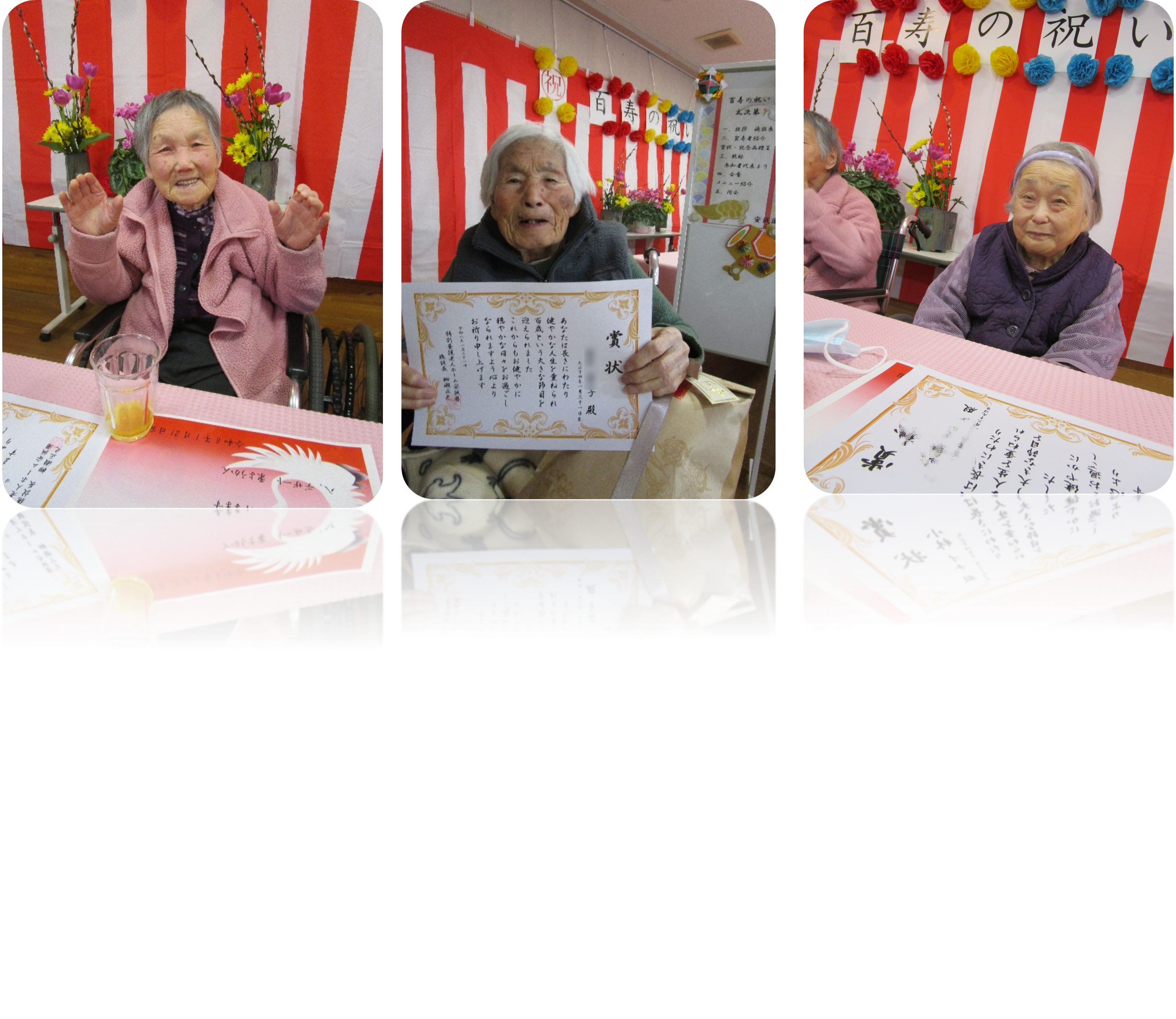 1月吉日、100歳を超えられたご利用者様3名の百寿のお祝い会を行いました。