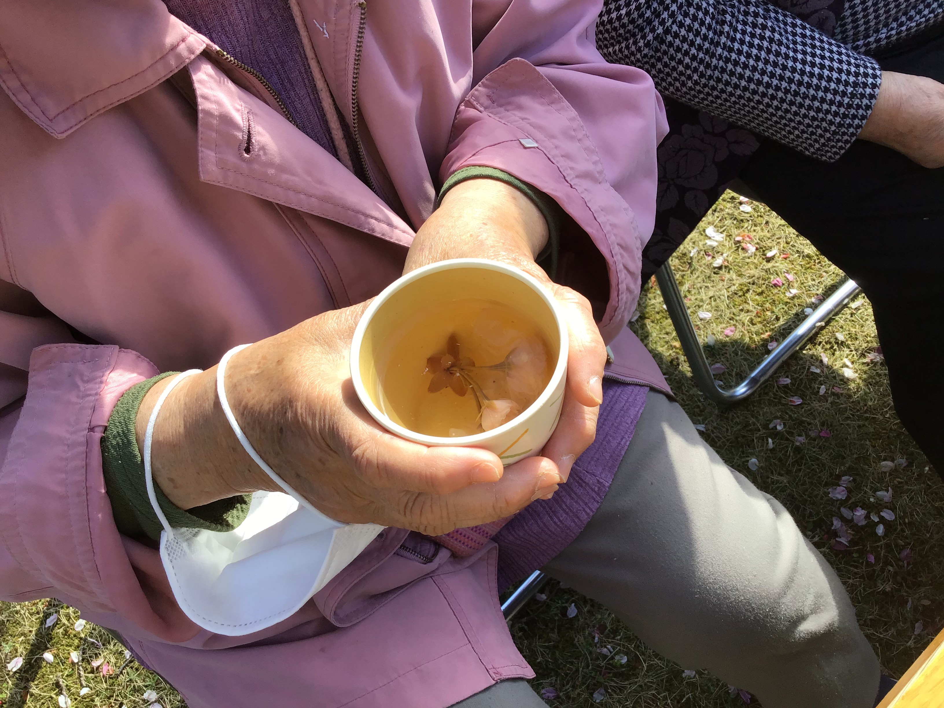 気温もぐっと上がりポカポカな陽気な中、おやつと一緒にさくら茶をお楽しみいただきました。