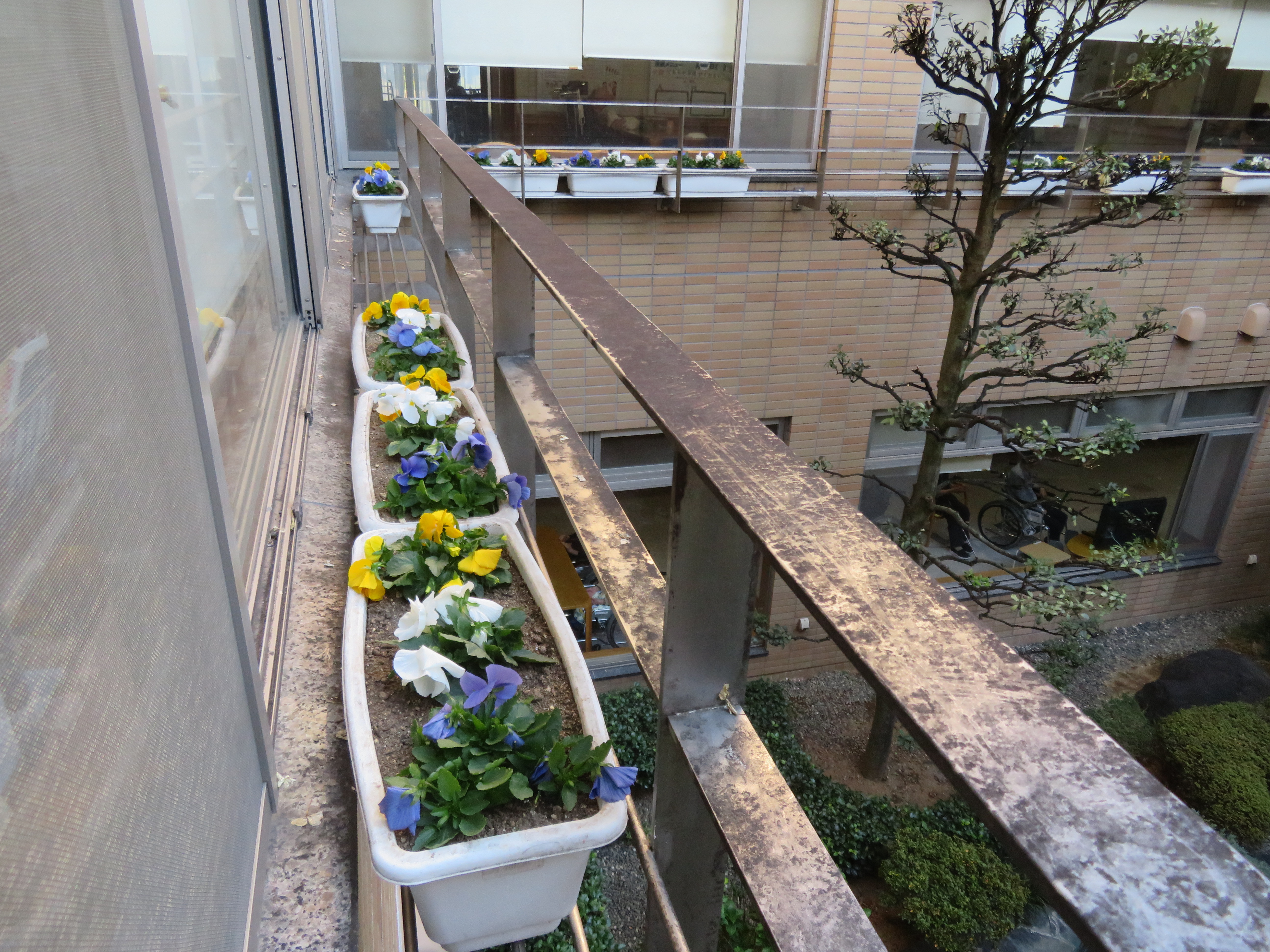 寒さに強いパンジーがキレイに咲いてご利用者や来客者、職員も楽しませてくれます。