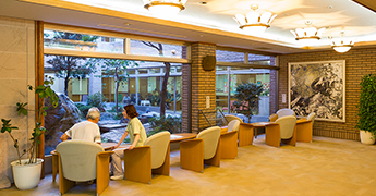天井も高く広々とした建物が多いのも安誠福祉会の特徴の一つです。滝が流れる中庭、広々とした日本庭園、鯉が泳いでいる等皆さんによく褒めて頂けます。