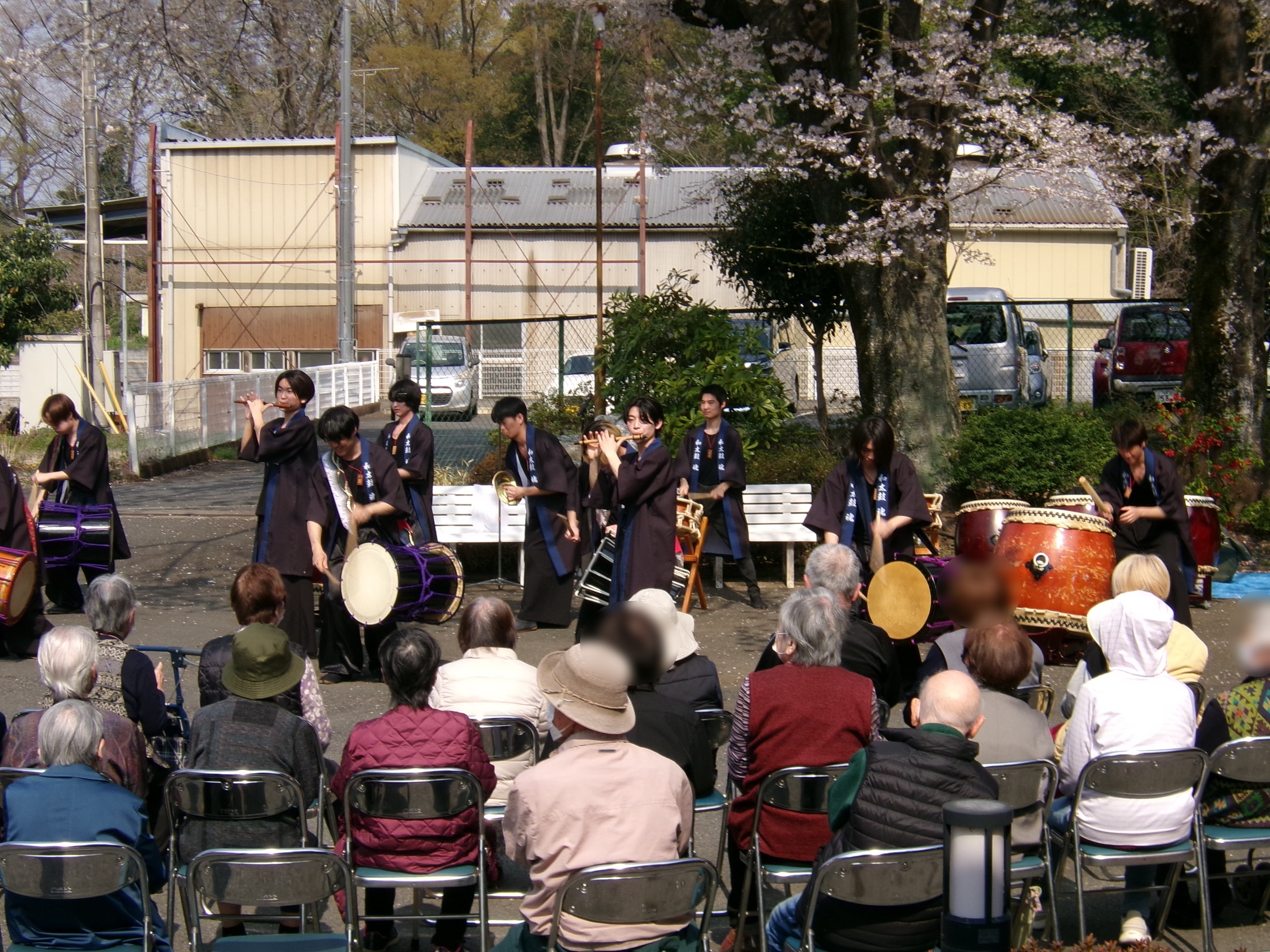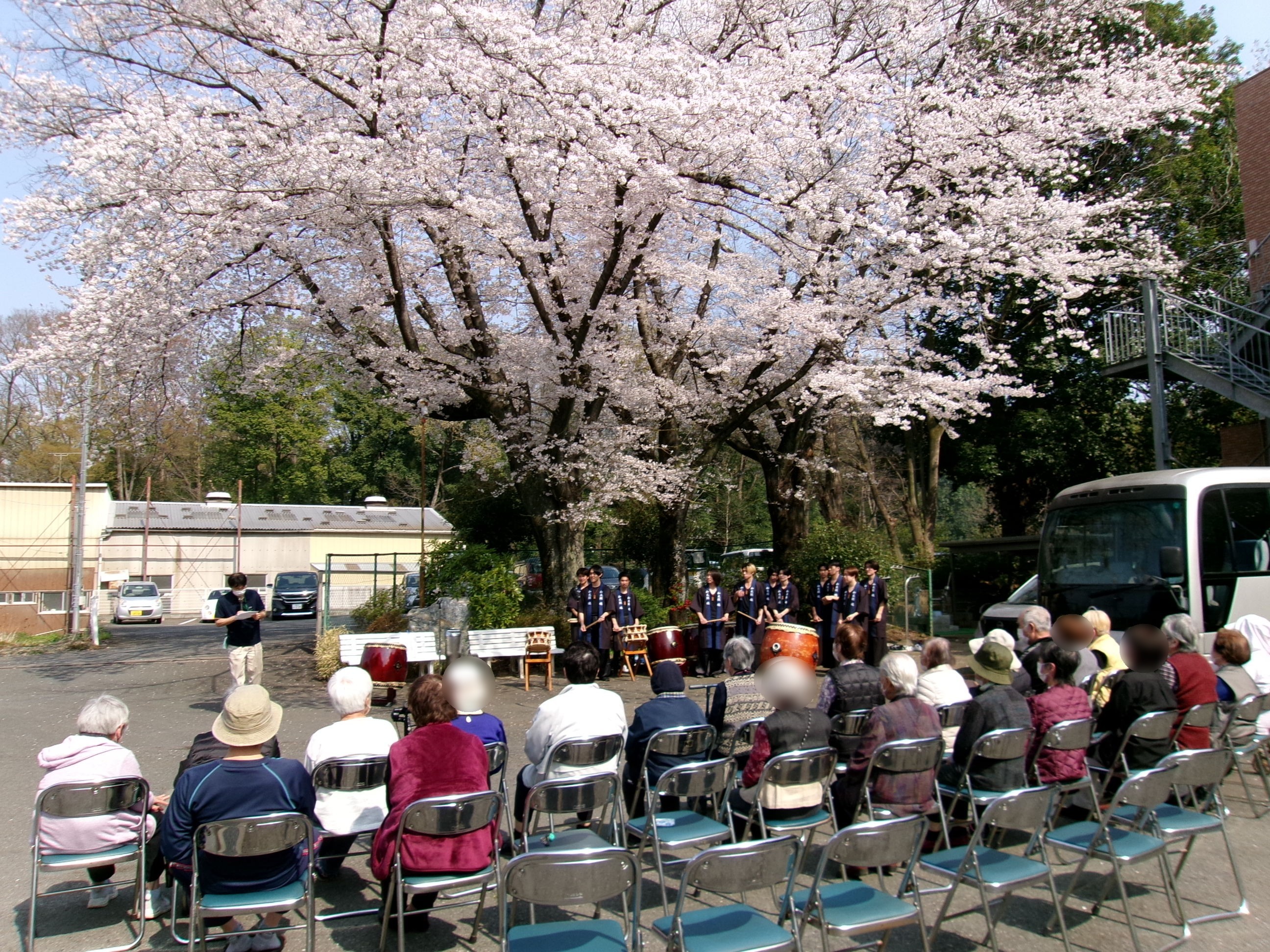満開の桜の下で、太鼓を叩く勇壮な姿にご入居者の皆様も大喜びでした