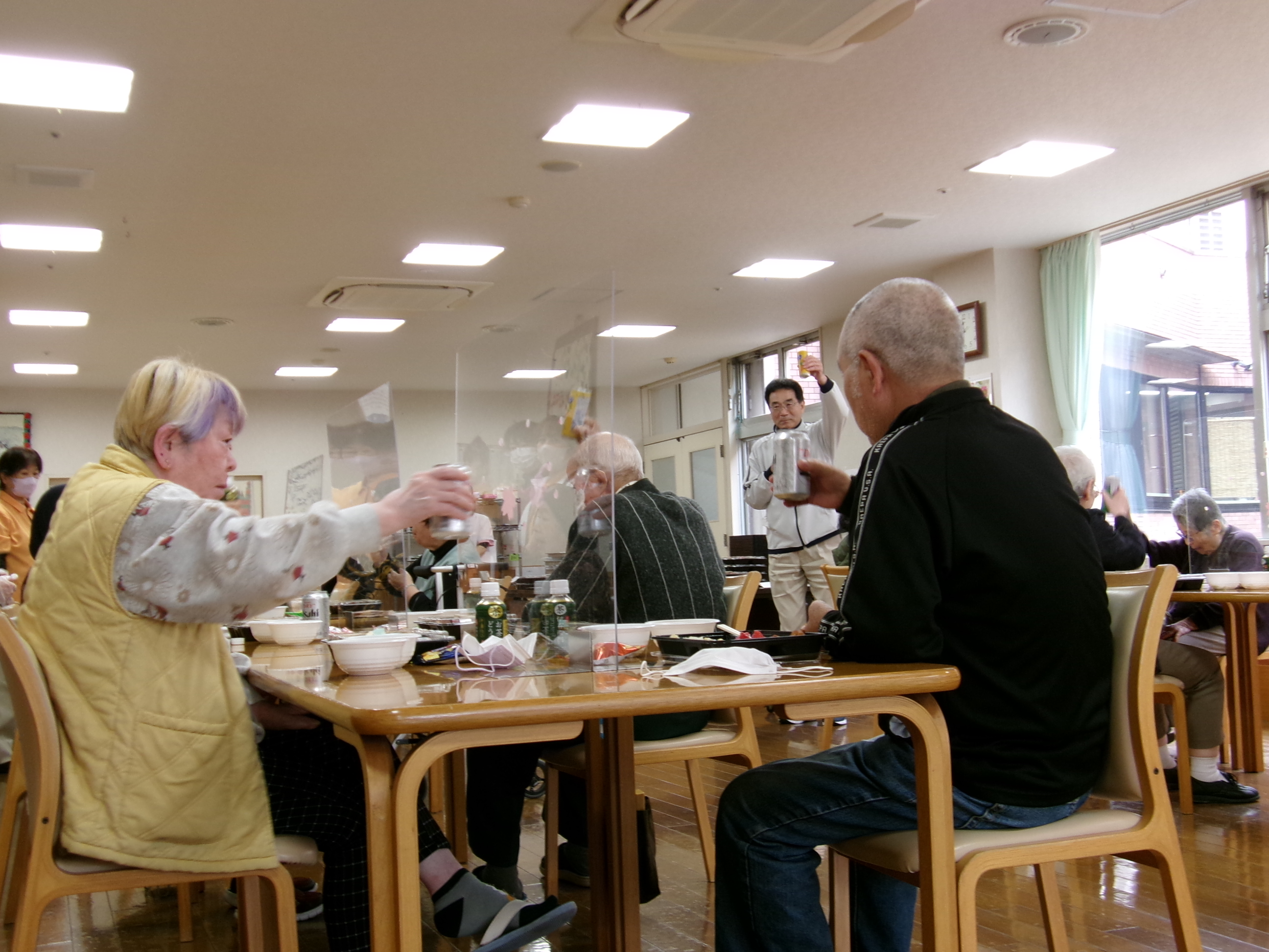 当日はあいにくの雨模様となってしまい、お花見会は食堂で行いました